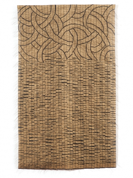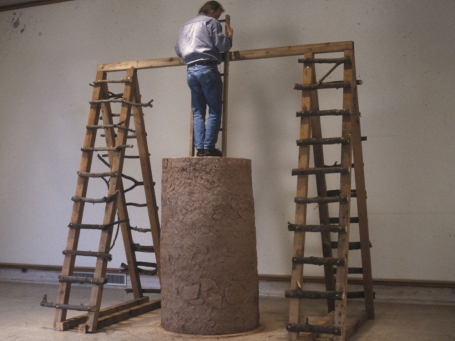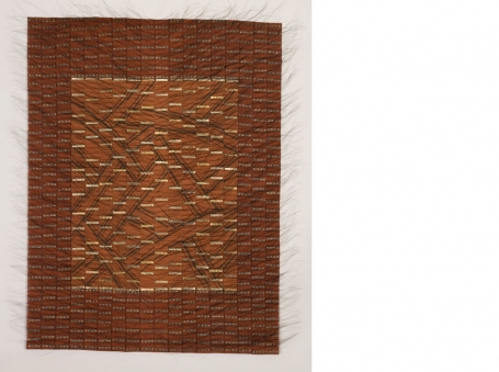 A love of nature, architecture, language and the history of fiber art have shaped the work of Hungarian-born Gyöngy Laky (1944), who lives in San Francisco. The primary material for her constructions, which often form words or convey political messages, has been twigs, "among the most beautiful linear elements in existence," she says. Laky holds a BA and an MA from the University of California, Berkeley, where fiber art pioneer Ed Rossbach was a mentor, and she is professor emerita at University of California, Davis, where she taught fiber art and environmental design for 30 years. Laky's works are at home inside the museum or gallery, but in particular outdoors, in meadows and hillsides in the U.S. and Europe, a testament to her endless experimentation. Exterior installations, she says, "stretch my mind, abilities, ideas, everything."