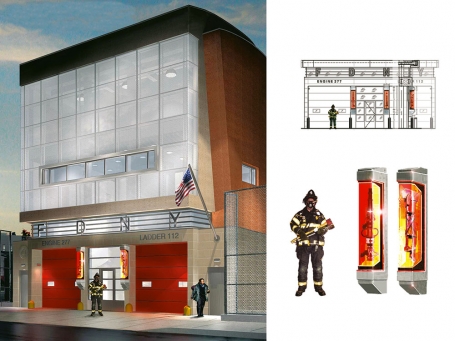 Following that public work, LaVerdiere received a grant from the New York City Department of Cultural Affairs Percent for Art Program to create twin lanterns commemorating the valor of all firemen for a newly completed firehouse in the Bushwick section of Brooklyn. Although the first design centered on the concept of an eternal flame with actual ignited gas, this idea proved logistically too difficult. LaVer-diere's solution, Sentinel Lanterns, 2007 , flanking the entrance, reveals, embedded in 4-foot-by-14-inch billets of cast acrylic, a fireman's ax and Halligan bar (a forcible entry tool) in one, and a high-pressure water cannon in the other. With lamps focused through the column from above and below, columns of light reminiscent of the Twin Towers guard the firehouse while the objects speak to the spirits of the lost firemen.