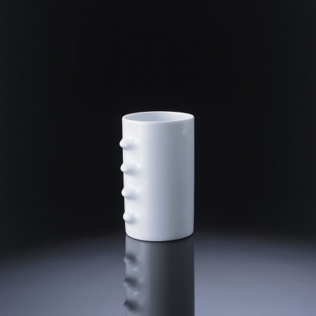 Some of the exhibition's more interesting works come from artist/designers who sought to expand the vocabulary of functional forms. In his delightfully braille-minded series of cups, produced by Hakusan, the late Japanese designer Masahiro Mori configured the handles and finger holds as biomorphic combinations of innies and outies, some burrowing into the walls as if rubbed there by a finger getting comfortable with its grip, others protruding like noses. The resulting abstract topography is as beautiful in its purpose as a Noguchi sculpture. In her Five Sense Touch! kitchenware for Kahla Porcelain, Barbara Schmidt softened the grips for hands and fingers by wrapping handles and areas meant to be grabbed with vibrantly colored felt-like fabrics (promised to be dishwasher safe). Stephen Reed's Radiator Mugs, as the name suggests, feature heat-dispensing vertical fins. Formed by the peaks and valleys of the undulating walls, the fins, or ribs, maximize the cups' surface area but minimize the hand's points of contact with it.