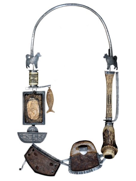 Born in Hawaii in 1936 of Chinese descent, Ron Ho, the Seattle-based jeweler and art educator, has been strongly influenced by the contrasts between contemporary American and traditional Chinese culture. Ho, who taught in the Bellevue, wa, school district for over 30 years, reflects in his work the diverse customs he has encountered, both growing up and through his worldwide travels, by including materials enriched by ethnic associations. A student of the noted Northwest artist Ramona Solberg, who pioneered the use of found objects in jewelry, Ho early on in his career employed such materials in unusual and inspired combinations that mirrored East-West multiculturalism. His work has been the subject of major retrospectives at the Bellevue Arts Museum and the Honolulu Art Academy. Assessing his work, the art critic Suzanne Beal has written, "Ho's coming to terms with his past can no doubt be credited with the birth of an altogether personal wearable art."