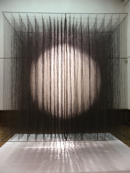 Known for her evanescent grid-like installations of knotted threads, Rebecca Medel (b. 1947) explores ideas involving time, space, metaphysics and symbolism. "What I search for," she says, "is a structure on the edge of being physically supportable, a structure of transparent weightlessness." A professor at Tyler School of Art in Philadelphia, Medel earned her BFA from Arizona State University and MFA from the University of California, Los Angeles. Her work has been in group exhibitions nationally and abroad, and she has had solo shows at the Neuberger Museum of Art in Purchase, NY, the North Dakota Museum of Art in Grand Forks and Browngrotta Gallery in Wilton, ct, among other venues. Her honors include two nea Artist Fellowships, a Bronze Medal from the Triennial of Tapestry in Lodz, Poland, and a Pew Fellowship in the Arts. "I work with images that speak of voids," Medel says, "and the beauty of mathematics through an underlying geometry and use of mathematical principles."