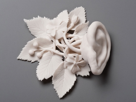 By contrast, MacDowell considers man's unintended interference with genetic codes through widespread pollution. In Taking Root 2, 2010, a human ear sprouts blossoms, berries, and foliage. The work's unglazed porcelain has a brittle translucence that perfectly communicates the unsustainable fragility of humankind's current relationship with the natural world.