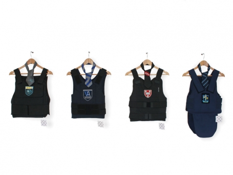 The British artist who goes by War Boutique offers an even more blatant social statement, pointing out the almost casual flow of militarization into our visual vernacular. Bak-2-skool, 2008, features four bulletproof vests, each emblazoned with academy insignia, fitted with a traditional school necktie, and sized for an elementary school child. While it is no longer shocking to see adult-size flak jackets, pint-sized Kevlar marked with school emblems can still startle. Yet with the dramatic rise in school shootings, how far away is this reality?