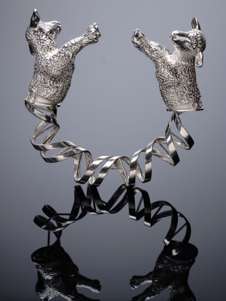 The troubled future already has arrived in the works of Americans Amy Johnston and Kate MacDowell. Johnston's sterling bracelet Did Dolly Dream of a Bio Mom?, 2010, makes witty reference to the Philip K. Dick novel Do Androids Dream of Electric Sheep?, which inspired the dystopic 1982 movie Blade Runner. Her work's helix-shaped band - ending in the bounding front halves of two fuzzy ruminants - alludes to Dolly the sheep, the first example of the extraordinary leap taken by cloning living creatures via DNA.