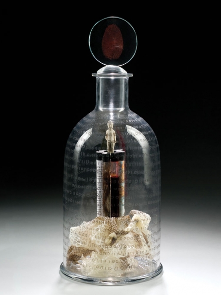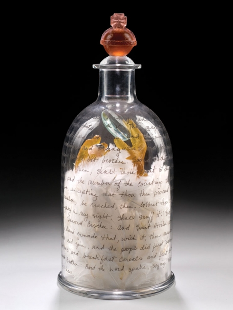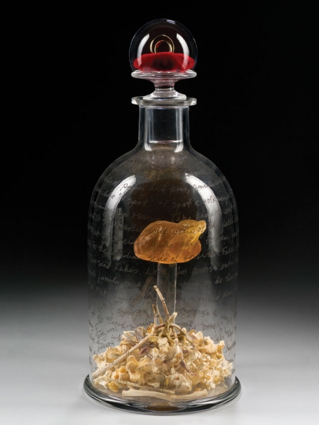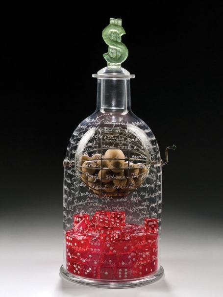 You can see evidence of both men's hands in the joint series. In Cure for Financial Insecurity, part of Apothecarium, Tate's cast-glass dollar sign sits atop the reliquary, which he etched with a cautionary tale about Ponzi-scheme king Bernie Madoff. But it was Petrovic - someone who enjoys tackling a tricky problem - who figured out how to suspend the bingo cage in his blown-glass dome.