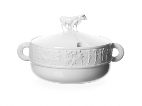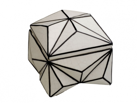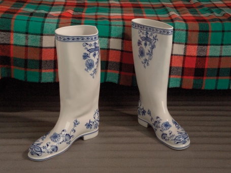 One of Qubus' best-known pieces has the form of a pair of Wellington boots, but cast in porcelain and embellished with a traditional blue "onion" pattern. Waterproof Vase - Onion not only gives a new reading to an old pattern, but also reinterprets function. Ornament & Crime, a porcelain head of Lenin with the blue onion pattern scattered across the face, exemplifies the studio's tilt toward social and political commentary with a humorous bite.