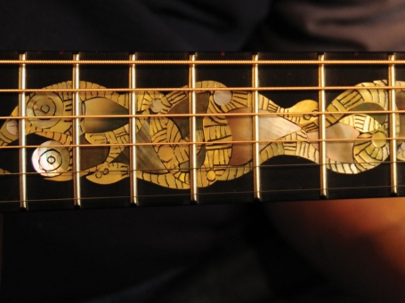 When he built an instrument for Hood, Baxendale scrutinized videos of Hood playing. It was time well spent. "Like many self-taught players,"Hood says, "I didn't necessarily learn the proper ways of certain technical things." Baxendale built the guitar to accommodate Hood's quirks, his style, his habitual movements.