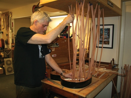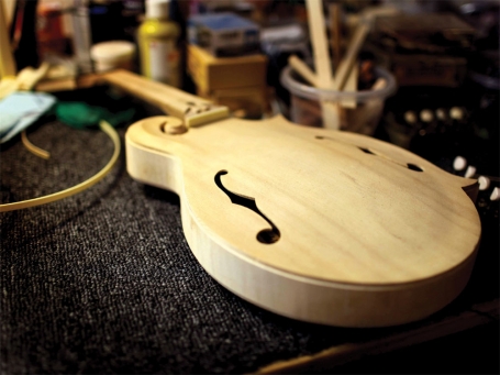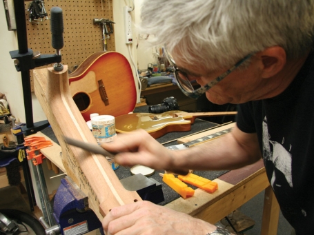 His painstaking attention to detail starts long before he picks up any tools. He builds "an individual instrument for the individual," he says, which requires him to analyze the most minute details of each musician's idiosyncratic handling of, and feeling for, his or her guitar. He wants to know: What was your first guitar? The first guitar you lusted after? What music do you play? What music do you admire?