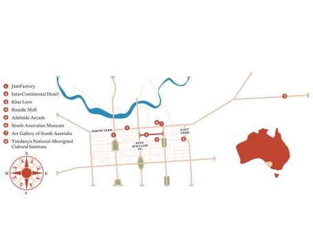 For travelers, there's great comfort in a grid. Adelaide, Australia, is a tight square mile, snugly bordered on all four sides by streets called "terraces": North Terrace, West Terrace, and so on. The old-fashioned architecture, like the city's old-fashioned name, soothes. Parks and gardens surround this lattice, concentrating growth in the urban core. Considerable suburban sprawl is invisible here. At the approximate center is a vast indoor food market, further balm for visitors. If you're not ogling fresh produce, you're likely on foot in the northern parts of town. Since crafts are your goal, you're on the way to JamFactory, near the northwest corner.
