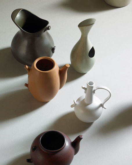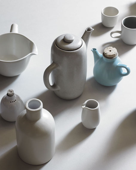[2/10] Counterclock-wise from top left: Pouring bowl, current production, design 1940s; salt shaker, current production, design 40s; Roy McMakin vase, design 90s; creamer, current production, design 80s; small teapot, current production, design 40s; studio mug, current production, design 40s; tea cup without handle, design 40s.