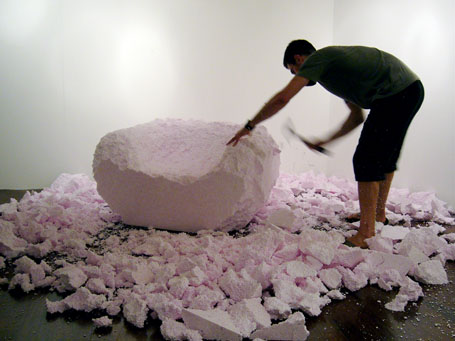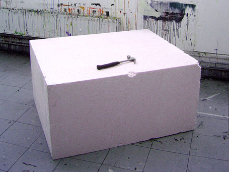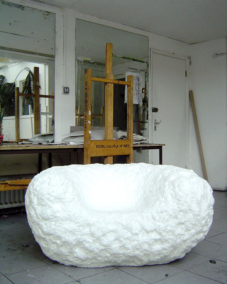 Lamb’s career as a furniture designer spans less than five years—he’s a recent graduate of the Royal College of Art—and so far his opus consists mostly of seats, which he names after their material: Copper Stool, Starch Chair, Sheet Steel Chair, Poly Chair. The last is made from standard-size rectangular hunks of polystyrene, from which Lamb subtracts, sculpting with the back of a hammer for about half an hour.