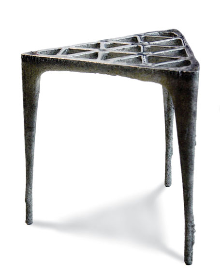 “I don’t make a lot of sketches. The form comes from what the process makes necessary,” he adds. When the tide goes out, beach sand is perfect for sculpting, but as the tide comes in, the subterranean water table rises invisibly; the rising water, slightly hard to predict, can shorten the one or more pewter legs when he pours the liquid metal after digging. So, employing a wise old principle, “three points of contact won’t wobble,” he gives the stool only three legs.