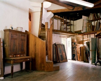 A decade after the initial construction, Poor—by then a famous potter, now married to the writer and friend of the Dadaists Bessie Breuer, and on his way to reestablishing his painting career—rebuilt the attached painting studio and pottery, adding a second story of bedrooms as light-filled and modern as the 1921 house is dark and archaic. The new, double-height studio unites craft and modernism in its handmade detail and generous space. Minimalist, tiles abut the casements framing the dramatic studio window; hardwood planks laid diagonally lead from the window to a stone fireplace fit for a manor house. In between these features, a spiral oak and tulipwood staircase looms like a pulpit from The Cabinet of Dr. Caligari and overhead, concrete brackets support interlacing beams and a flat, unplastered ceiling. Alternating as workplace and party space, this extraordinary room both contrasts with and complements the Arts and Crafts living room below.