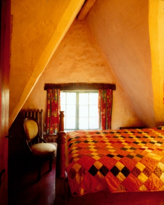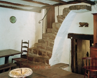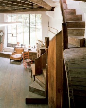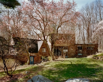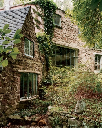 In the early 1920s, building a house single-handedly was considered odd, the antithesis of the skyscrapers taking root to the south. The stone cottage that rose over the summer of 1920 took on the aspect of a performance, drawing onlookers to watch the sandy-haired artist at work. Aided by sketches and some experience with tools, Poor learned on the job. When an interior arch in the living room began to spread, he merely extended it through the wall, making a flying buttress in the process. Stone steps on the opposite side of this room end abruptly at a cantilevered landing, the resulting gap reinforcing its sculptural aspect. Ruled as much by pragmatism as aesthetics, Poor also embraced modern materials: concrete and metal lath formed the flat roof over the kitchen as well as the provisional, gently pitched one over the original painting studio; asbestos shingles covered the near-perfect geometry of the steeply pitched gables and main roof. In the later additions of 1931 and 1949, Poor hit other modern notes with cinder blocks, metal casement windows and flat concrete roofs, signature features of the later houses built for friends and neighbors such as the cartoonist Milton Caniff and the aforementioned actor/director Houseman.