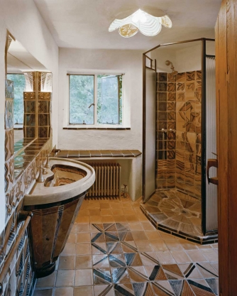 In creating Crow House, Poor came to realize the value of the handmade and the experience led to experimentation in other areas. It was here that he taught himself to make his famous pottery, planned his murals and constructed furniture. Details of these efforts reveal themselves everywhere: in the ceramic doorknobs, carved thumb latches, joined tables, wardrobes and benches. Imbedded tiles reveal remnants of larger architectural projects, like that for the Union Dime Savings Bank in Manhattan, making the house, in more ways than one, an archive. The bathroom of hand-painted tiles embellished with abstract patterns and Matissean nudes documents almost completely an interior from the first exhibition of the American Designer’s Gallery, an association of native and foreign-born artists, designers and craftsmen who endeavored to promote an American design identity by exhibiting modern interiors and decorative arts in Manhattan in the 1920s.