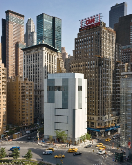 What you see is what you get. The choice to commission Allied Works Architecture to gut renovate the controversial and elegantly odd Huntington Hartford building at 2 Columbus Circle in Manhattan reflected the Museum of Arts & Design’s long-standing criteria for selecting all of its artists and designers: Allied was chosen, in part, because they were emerging, not yet made men. The façade the firm designed is as much a work of craftsmanship as many of the objects in the museum’s permanent collection, of which the building’s design will finally allow permanent display after half a century in storage. In fact, a number of architectural elements echo the values and goals of the museum, which centers on three-dimensional objects handmade through an alliance of art and industry. The architect’s choice to pay close attention to material and process—in effect, creating a building that is a vast crafted object—suited MAD perfectly.