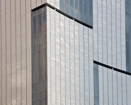 Most striking, however, was the choice to create a terra-cotta cladding glazed with a custom color, the face of which transforms ambient city light, drawing it onto the building like paint to a canvas, and then reflecting it back onto the street. One of the few freestanding buildings in New York, 2 Columbus Circle offered the designers a rare opportunity to work with a city building that receives light on every side. Deliberately seeking a material in character with the museum and the nature of craft, the architects realized a clay tile would allow them to apply a glaze that would affect the viewer’s perception of the building.