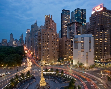 “In bright sunlight only parts of the building light up,” explains Lommen. “Some of the most shimmering qualities of the façade appear on an overcast day when the light bounces all around.” Indeed, at different times and from different vantage points, the building looks buttery, armored in pewter 0r fulgent as an oil slick. Now, 2 Columbus Circle may just be a dark city’s silver lining, the best reason for New Yorkers to wish for rain.