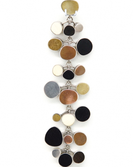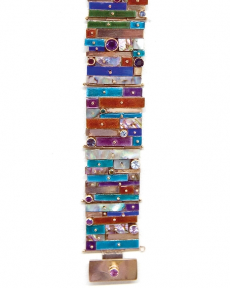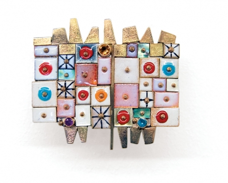 A bracelet from 1987 is a dazzling convergence of parts. Juicy bits of enameled metal mixed with shell and stone create a tapestry of color and texture, at once richly ornamental and intrinsically structural. Spherical gold rivets provide a counterpoint, piercing the enameled surface while holding it in place. From the side, the piece reveals a substantial corporeality, each curved panel populated like a city block with enameled panes. A brooch and earring set from 1990 is a play on white, relieved from preciousness by an infectious sense of fun. Squares of enamel are painted with targets of red and blue, some with cross-hairs of black. Fitted with stones, panels of richly textured gold and tiny metal spheres, it creates a commotion of form, color and heedless happiness.