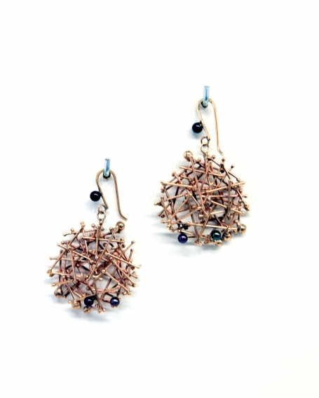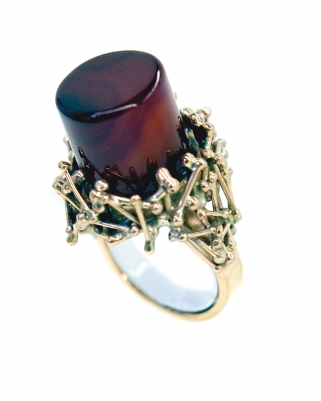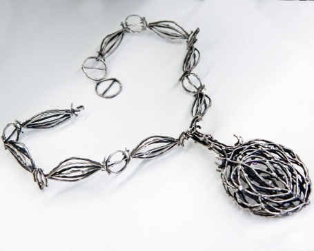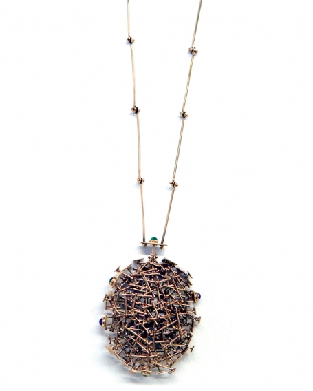 A testament to the joy of making and the experience of using, the exhibition begins with jewelry works from the 50s though the 70s that embody an undeniable physicality. Big Neck, 1969, an intensely wrought affair of interlocking links supporting a silver and amethyst pendant, is immense and aggressive. Other pieces attest to a more refined sense of scale and structure, while embracing a thoughtful economy. A ring from 1974 features a delicate nest of gold wires supporting a bold plug of quartz, while another from the 60s is distinguished by a fringe of pearls poised to brush the skin of one’s fingers. A neckpiece from 1973 includes a hovering mass of gold filaments with spheres of semi-precious color. The chain that supports this beautiful mess is ingeniously articulated of bits of gold wire, doing a lot with a little.