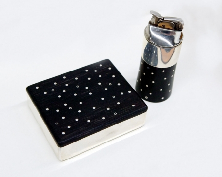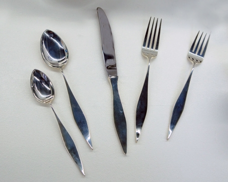 Pardon’s work in industry, incorporating a range of materials including sterling, wood, enamel, stainless steel and plastic, is highlighted by the exquisite Elan flatware set, 1962, for Old Newbury Crafters. Forged from sterling billets by artisans Bob Lapham and Geoffrey Blake, it has a delicately planished skin, as subtle and active as the surface of water. The pattern evokes a tapering line blossoming into the functional familiarity of the bowl of a spoon, fork tines and a stainless knife blade.