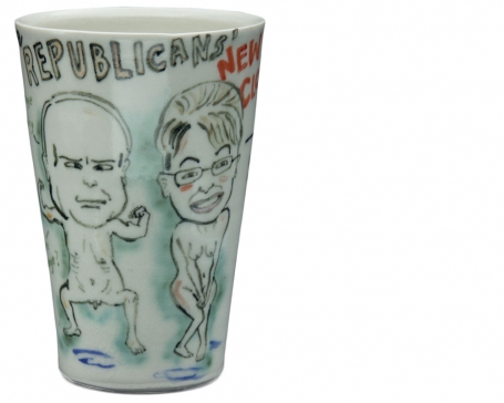 Though nothing in ceramic history has been exactly like this project, there are many historical examples of ceramics that bear imagery with political messages and, like Obamaware, most of that imagery comes from other media—prints, drawings, oral history or myth. The 27 artists who created work for this project drew from the existing repertoire of imagery and words that are understood to signify the Obama-Biden campaign: images of the candidate himself, the blue and red campaign logo, words like “hope” and “change,” and countervailing imagery from the McCain-Palin camp, which was uniformly presented in a satirical vein [figure 6]. Many of the historical examples discussed here are commemorative or represent the views of artists responding to events in their own time. Obamaware, by contrast, was anticipatory.