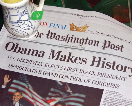 As a fitting coda to the project, Ayumi Horie has now posted over 30 “Pots in Action” photographs on her website, showing Obamaware in domestic settings all over the country. Teacups accompany now-historic newspaper headlines proclaiming Obama’s victory, champagne flows from a Moët bottle into an Obama mug, and many cheerful voters pose with their handmade souvenirs. The internet makes possible a rapid, dynamic and almost instantaneous dialogue between potter and consumer that has never been possible before. It allows objects formerly confined to the kitchen or the dining room to transcend geographical boundaries and become vehicles for narrative on a grander scale, responding to events in real time. It is heartening that the digital universe enthusiastically embraced these political pots even as they embodied a narrative tradition as ancient as fired clay itself.
