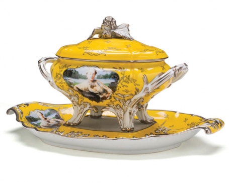Madame de Pompadour (nee Poisson) soup tureen, 1990, porcelain, glazed, silk-screened, painted.
