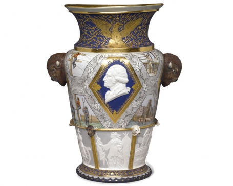 The parallel between ceramics and print is further evidenced by the decorations on English and Chinese export porcelain made for the American market. Numerous examples from the 18th and 19th century depicted patriotic portraits of George Washington or the French-born Revolutionary War hero Lafayette. The bald eagle was prominently featured in china decorated with the emblem of the Order of Cincinnatus, a patriotic fraternal organization named for an ancient Roman hero, of which George Washington was the first president. World’s fairs offered unprecedented exposure for large-scale ceramic showpieces like the iconic Century Vase, which Karl Müller designed for the Union Porcelain Works booth at the Philadelphia Centennial Exhibition of 1876 [figure 8]. The vase features a relief bust of Washington along with imagery of North American flora and fauna, as well as scenes of progress from the nation’s first 100 years. The so-called Trenton Vase was made for the Louisiana Purchase Exposition in 1904 and bears a rendering of Emanuel Leutze’s Washington Crossing the Delaware (1851). The Leutze image was widely circulated in the second half of the 19th century in the form of lithographs and became retrospectively an icon of the revolution.