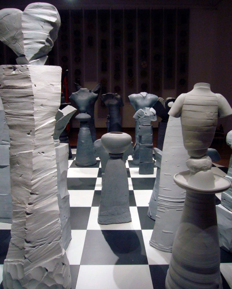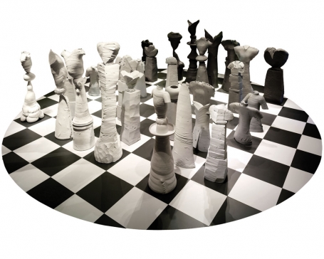 Fortunately, not every détournement leads to the bazaar. A room-size installation of disparate works from the past two decades entitled World Peace: Finding Common Ground (We’re All in This Together, Do Unto Others, Your Move!), takes on a unified grandeur because of the integrated employment of objects, pedestals, repainting, and concept. In World Peace, preexisting sculptures, based largely on the human torso, have been turned into monumental chess pieces and then staged on a circular checkerboard. Here, a new cloak of paint furthers conceptual meaning: The work’s achromatic scale, black to white, encom- passes both opposition and a coming together in the gray shades of compromise.