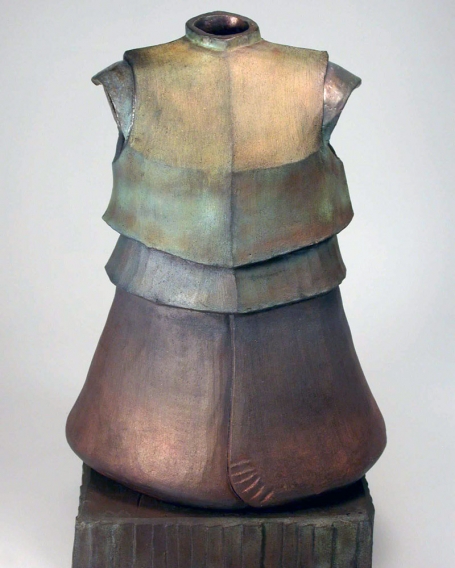 Nancy Jurs gained recognition during the 1990s for her chunky ceramics that riffed on functional domestic ware. At the same time, she created a number of ambitious, large-scale ceramic sculptures that elaborated on the shapes and surfaces of her intimate efforts, but encompassed a more complex conceptual purpose. Her fired clay had the appearance of expressive cubic forms that might have been roughed out from blocks of stone. Surfaces bore the metallic, iridescent lusters associated with long-buried objects. The overall character had a rough-hewn strength, organic in feel, even geologic—something shaped by nature over time.