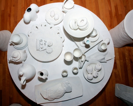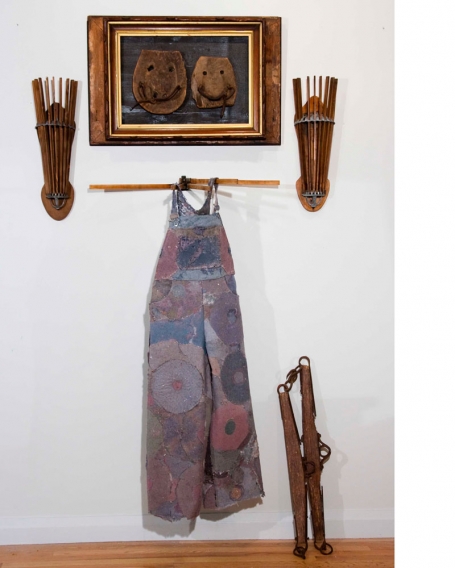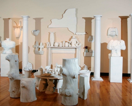 A particularly recondite example of Jurs’s process of reclamation is represented by Déjà Vu: Fifty Pieces, Fifty Years (Separate and Equal). It is a very large installation that features one piece from every year of her art practice. Each object has had its original surface covered in whitewash and is arranged among and on similarly painted found objects—an antique mantle, four architectural columns and a woodsy table and chairs. It is tempting to recall the example of Louise Nevelson and Dawn’s Wedding Chapel, but the reductive nature of Nevelson’s monochrome seems to work against Jurs’s retrospective goal. By muffling the characteristics that could construe a chronology, she leaves us with an anachronistic jumble, a seemingly bewitched thrift shop where anything that might be of interest has been ruined by a thick coat of paint.