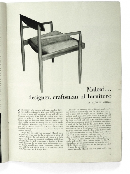 When Sherley Ashton wrote about Sam Maloof, now 93, in the June 1954 Craft Horizons, the master woodworker’s career had just begun. Even then he approached woodworking with the conviction that the designer and maker are inseparable. Notable for its elegant functionality, his work has been widely exhibited and was the subject of a retrospective at the Smithsonian American Art Museum’s Renwick Gallery and is in its permanent collection as well as in those of many other museums.