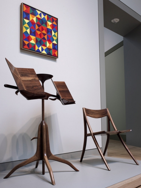 A bit of backstory: in 1972 Jan Hlinka, principal violist with the Los Angeles Philharmonic, commissioned Maloof to make a music stand with a pair of racks to accommodate two players, as well as a practice chair that would provide good back support and plenty of leg and elbow room. Maloof obliged, crafting handsome designs in Brazilian rosewood. The two men became friends, and at the musician’s request, Maloof never replicated the chair. When Hlinka died, his widow, recognizing the importance of the pieces, returned them to their maker.