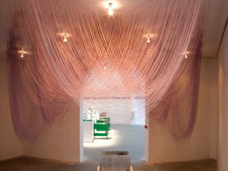 Like Silverman and Tehrani, the Ball-Nogues partners have cross-disciplinary leanings and eclectic backgrounds. Ball did architectural design as well as set design for film; in the early 90s he worked on music videos by Janet Jackson, Marilyn Manson and Nine Inch Nails. Gaston Nogues spent over a decade with the celebrated architect Frank Gehry’s firm, where he was “the go-to guy for unusual models, product prototypes and full-scale mockups of building systems,” says Ball. For their MOCA installation (July 26-November 15), organized by Alma Ruiz, they’ve expanded and reinterpreted an environment they did for the 2008 Venice Architecture Biennale-an elaborate contrivance of thousands of strings, hung in space in catenary curves to form a kind of dense rolling fog. A custom software program was used to create iterations of catenary arrays; Ball-Nogues also designed and fabricated a machine, called the Installator, to measure and cut the individual lengths of string as determined by the computer. Then they gathered a bunch of friends and colleagues together for the actual installation. As Ball explains, “Our work is often very intricate and requires a lot of labor. Often it’s done without many financial resources. We make up for that with human resources.”