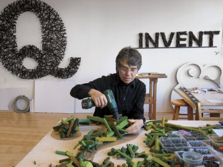 A love of nature, architecture, language and the history of fiber art have shaped the work of Hungarian-born Gyöngy Laky (1944), who lives in San Francisco. The primary material for her constructions, which often form words or convey political messages, has been twigs, "among the most beautiful linear elements in existence," she says. Laky holds a BA and an MA from the University of California, Berkeley, where fiber art pioneer Ed Rossbach was a mentor, and she is professor emerita at University of California, Davis, where she taught fiber art and environmental design for 30 years. Laky's works are at home inside the museum or gallery, but in particular outdoors, in meadows and hillsides in the U.S. and Europe, a testament to her endless experimentation. Exterior installations, she says, "stretch my mind, abilities, ideas, everything."