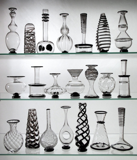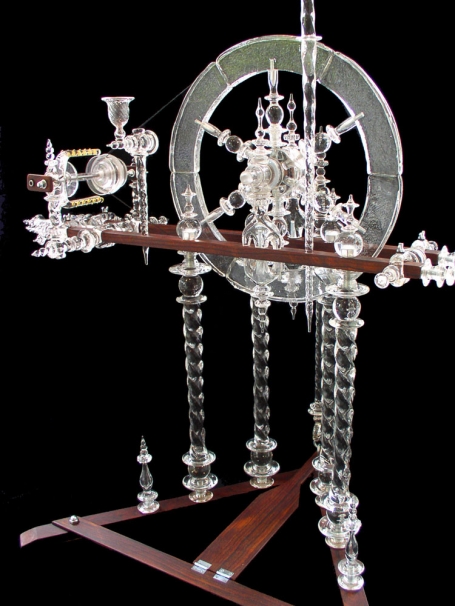 “I try to play with functionality,” says Paiko, 32, whose down-to-earth manner contrasts with the gothic eccentricity of his works. “I really try to stay away from objects for objects’ sake, on a pedestal, functionless.” Based in Portland, OR, he divides his production into “vesselware” (candlesticks, vases and other decorative but conventionally useful items) and “sculptural vesselware” (such as the bell jars), all of which he’ll happily customize. Then there are his pure “sculptures,” which include some wildly unlikely contrivances in glass: a fairy-tale spinning wheel that can actually produce yarn, a seismograph that can measure earthquakes and Locus, a funhouse-like mirror reflecting distorted images. An art history professor who saw Paiko’s pieces at the ACC Baltimore craft show remarked that they seemed “somewhat out of time,” at once antiquated and futuristic. It was, the artist says, “the best compliment I ever got.”