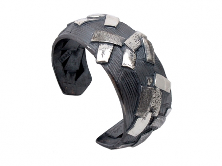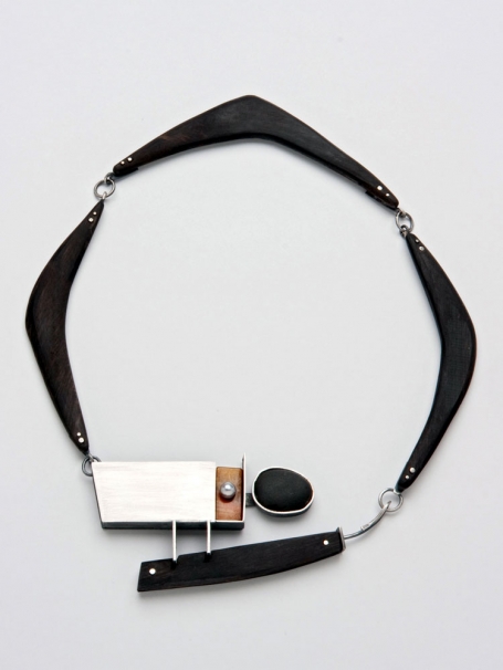 Necklace in sterling silver, ebony, beach pebble, pearl, bakelite, and oxidized silver.