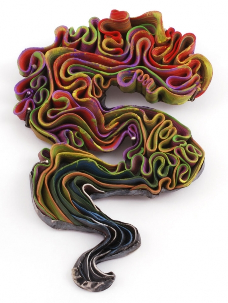 Other works implicitly capture a look and vibe. Laurie Hall’s Boomerang necklace (1950) is an elegant take on mid-century modern, while Steve Ford and David Forlano’s trippy, Carnaby-Street-inspired brooch evokes 1964, the year both were born. Todd Pownell ingeniously blends past and present in La Beaute est dans la rue, an iPod nano he’s adorned with iconic poster art from the Paris student riots of 1968, and loaded with video, stills and music from that tumultuous year.