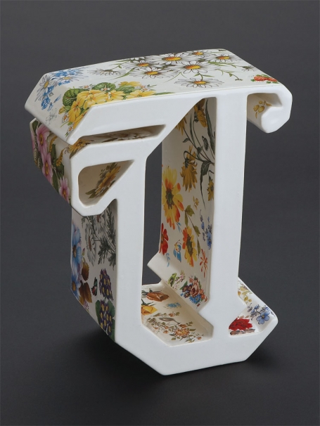 Stephanie DeArmond’s sculptural letterforms are not easily defined by art-school limitations of sculpture, vessel and design. Her work humorously appropriates text from American subculture and abstracts it into aesthetic form, as in Cross-stitch T. DeArmond’s sculpture evokes the preciousness and innocence of your grandmother’s china cabinet, yet a closer reading reveals unexpected phrases, like that in Best/Beast. The artist often cites lyrics taken directly from American pop-cultural forces like hip-hop and indie rock. “I use rap lyrics because I am interested in connecting that kind of culture to fine china,” she says. “I love the idea of rappers with gold rings and baggy pants with a grandma drinking out of a teacup. I love how culturally distant they are from each other, but I personally have interest in both.”