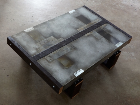 Roeper’s sensitive combinations of various hardwoods (all salvaged locally) and metals offer customers a rich range of tones and flavors: oak with brass is earthy and elemental; substitute zinc, and the result is lunar, futuristic. “One thing that’s always different is the patina,” he says. “The etching always gives you something new.” It’s that counterpoint and balance—thoughtful design, construction and detailing combined with the unpredictable surface effects of fire and acid—that invigorate Roeper’s pieces, which are all fully functional.