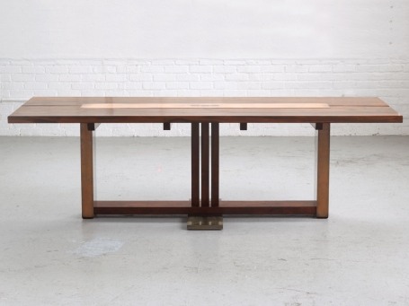 While his smaller tables tend to be sculptural and experimental, he prefers to “hold back” in his designs for dining, which are simpler in appearance yet still ingenious. His San Andreas table has a metal “fault line” running lengthwise down the middle that acts as a surface for a wine bottle, candle or serving dish, but also drops down on either end to form pedestals. “I’m not a huge fan of just inlay,” Roeper says of his use of metal components. “I want it to feel like it belongs to the structure and the form.”