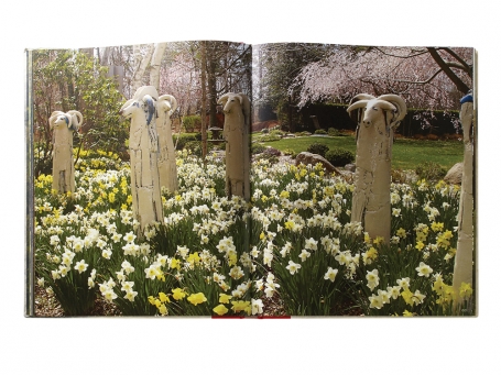 The metaphor of weaving is invoked in the book-appro-priate given Larsen's stature as one of the world's great textile designers. And it is true that life and art are in constant interplay in Larsen's world. Yet sometimes, as in Chappellet's image of Sol LeWitt's stately Irregular Progression, High #7, where the sculpture is softly scrimmed by trees, the shadows of their branches embracing the work, it's as though distinctions between art and nature, the man-made and earth-given, become meaningless. Everything is alive and vital, creating magical, previously unimagined relationships. This is a sensuous environment, and the cover, the creature's very skin-handmade washi (mulberry paper), fold-dyed in sumi ink-hints at the wonders of LongHouse.