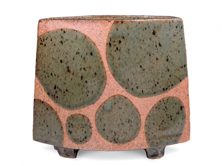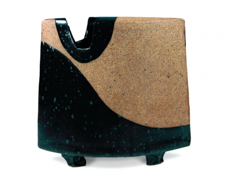 These days Ta builds his forms out of slabs, then uses resist and masking techniques to decorate each surface before glazing and firing. Drawing from a vocabulary of lines and shapes, he's able to design an endless variety of free-form geometric compositions in light/dark color pairings (often tan and black), all meant to illustrate "the play of positive and negative space and the tension between boundary and flow," he explains.