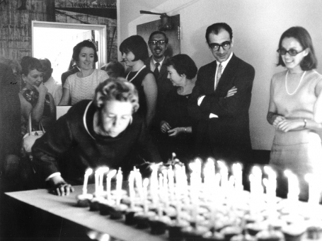 American Craft magazine began life in 1941 as an unnamed, 27-page newsletter, published by the Handcraft Cooperative League of America, led by Aileen Osborn Webb. (That group incorporated in 1939, but traces its genesis, with Webb as a prime mover, to 1929.) "The most important news in the first issue ... noted the imminent merger of the two national groups," Webb says in her memoirs; she was speaking of the 1942 union of Webb's group with the American Handcraft Council, led by Anne Morgan, her friend. (That's Webb, above, celebrating a birthday in a 1967 photo.)