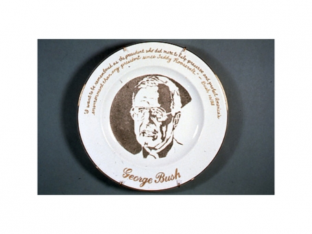 [9/11] Kim Abeles, commemorative smog plates (George Bush in 40 Days of Smog), 1991, particulate matter (smog and soot) on porcelain, diameter: 9", text reads: "I want to be remembered as the president who did more to help preserve and protect America's environment than any president since Teddy Roosevelt' Bush 10/8." Since the worst of our air can't be seen, Smog Collectors are both literal and metaphoric depictions of the current conditions of our life source." (Abeles)