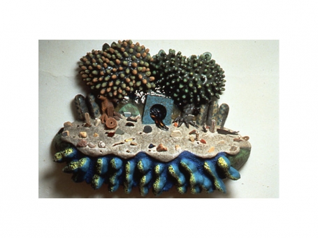 [7/11] Mary Jo Bole, Cleveland Beach Scene: collection holder, 1986, terracotta, 36" x 44" x 15", a sewage outlet pours effluence onto the sand where there is a consequent accumulation of natural waste and urban debris.