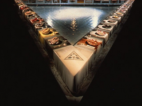 [5/11] Judy Chicago, The Dinner Party, 1979, mixed media, 48' x 48' x 48', conceived as a tribute to prominent women through history whose contributions to culture and society have traditionally been overlooked. The installation piece was a collaboration of many different artists under Chicago's direction. There are thirty-nine plates and nine hundred and ninety nine names on tiles commemorating actual and mythical women.