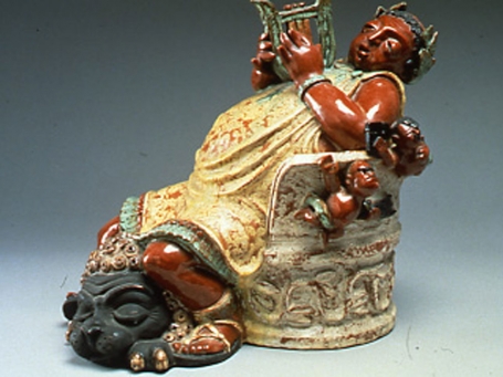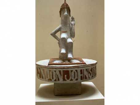 [3/11] Gerry Williams, The Stepping Down of Lyndon Johnson, 1970, stoneware, 20" x 30", during the primaries following Johnson's presidency that perpetuated the Vietnam War the anti-war Democrats fielded Eugene McCarthy as a candidate opposed to the war. As a consequence of the shift of support Johnson was forced to step down February 1968. The image and title also refer to Buddhist statuary where the Buddha is shown leaving his footprint in the earth as he departs.