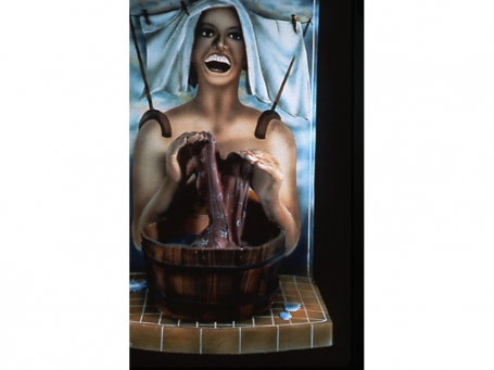 [4/11] Patty Warashina, Wash n' Wear, 1976, clay, underglaze, 27" x 16" x 16", shows a woman as a psychological portrait, in the stereotype role of laundress, washing by hand, her shoulders supporting the clothesline while displaying a force expression of happiness and fulfillment.